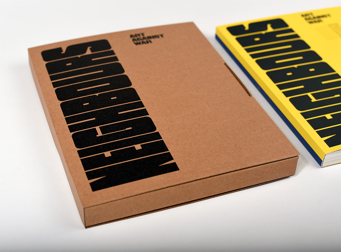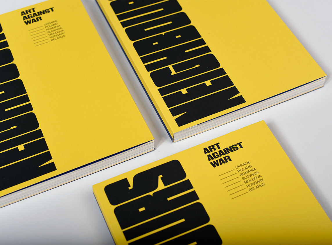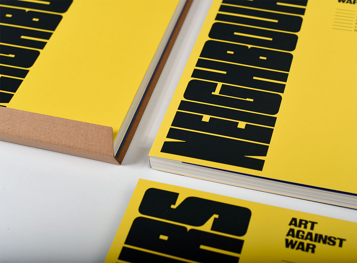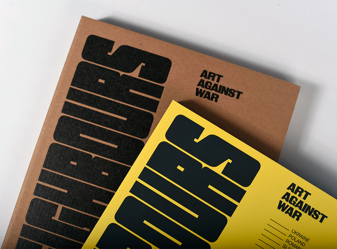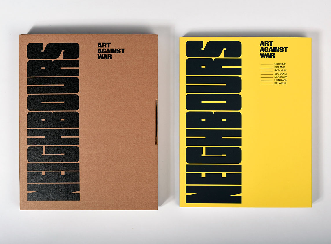 A complete NEIGHBOURS Art Against War art book, paperback, sewn and glued binding, featuring exceptional works of art by 114 artists from Ukraine, Poland, Hungary, Slovakia, Moldova, Romania, and Belarus, presented on 140 pages. The inside of the art book is printed on high-quality Munken Pure Rough 170 g paper in five colours. The cover is made of 300 g cardboard with opening flaps and comes printed in two Pantone colours – the colours of Ukraine. In addition, it comes in original cardboard packaging.