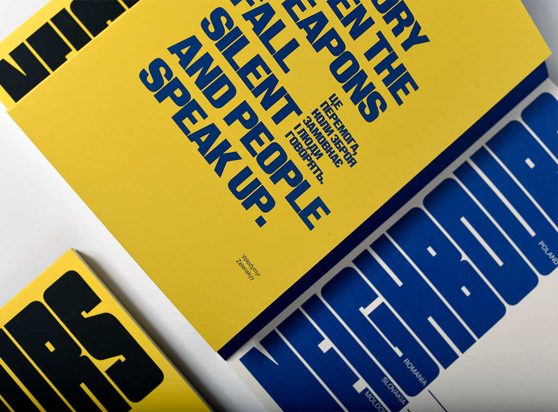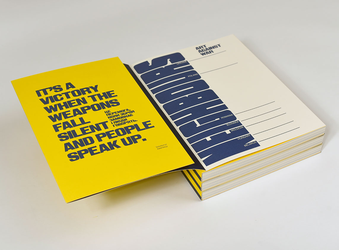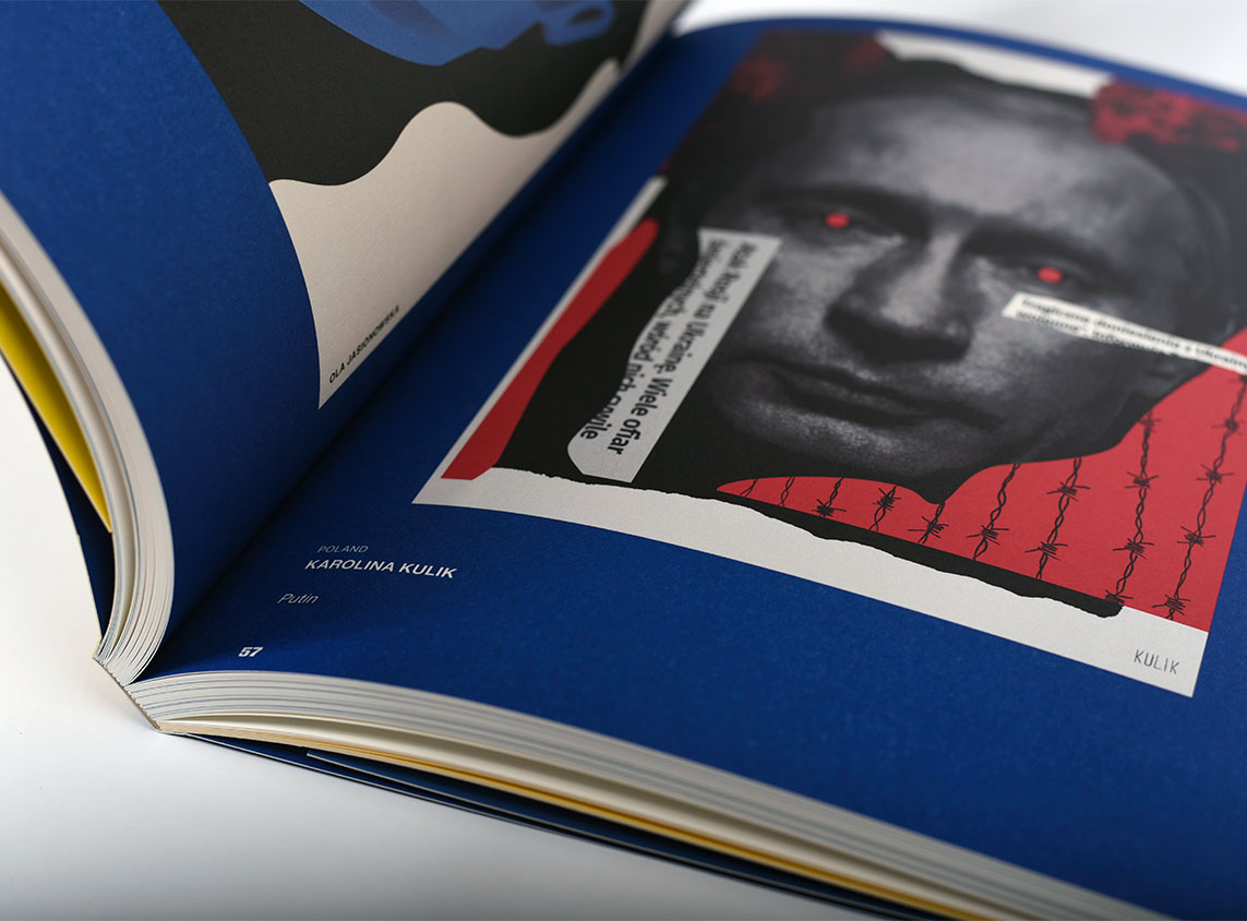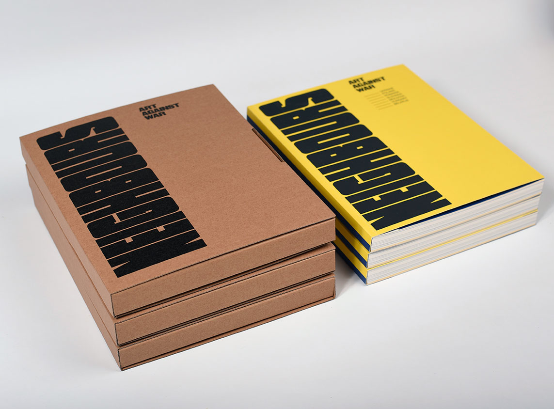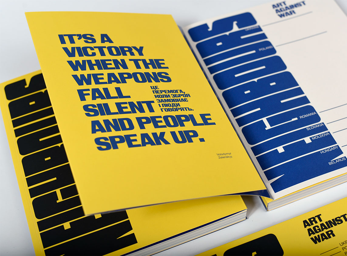 A complete NEIGHBOURS Art Against War art book, paperback, sewn and glued binding, featuring exceptional works of art by 114 artists from Ukraine, Poland, Hungary, Slovakia, Moldova, Romania, and Belarus, presented on 140 pages. The inside of the art book is printed on high-quality Munken Pure Rough 170 g paper in five colours. The cover is made of 300 g cardboard with opening flaps and comes printed in two Pantone colours – the colours of Ukraine. In addition, it comes in original cardboard packaging.